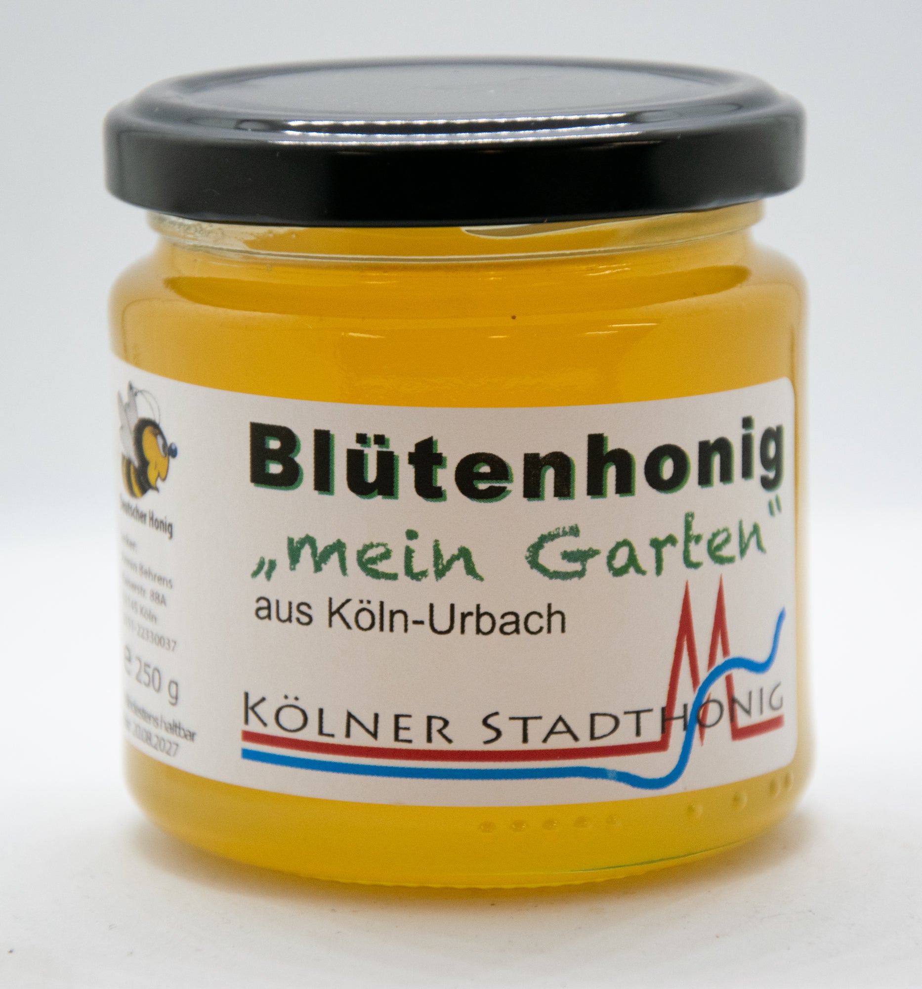 Blütenhonig aus meinem Garten in Porz-Urbach. Flüssig-sämiger Honig mit dem Potpourri der blumigen Noten die in den Gärten der Nachbarschaft von den Bienen gefunden werden plus Edelkastanie und Linde. Malzig-Herb im Geschmack. Dieselbe Qualität wie mein Garten im 500g Glas